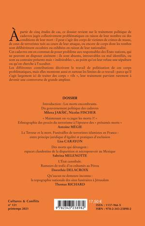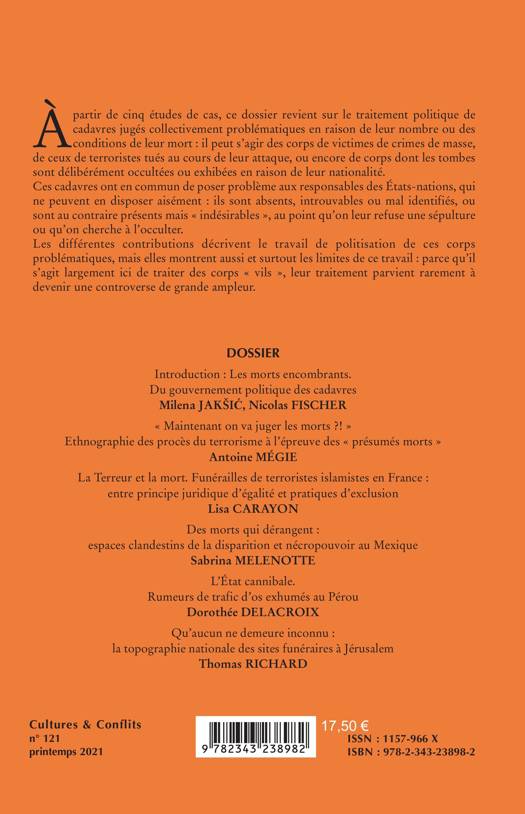 À partir de cinq études de cas, ce dossier revient sur le traitement politique de cadavres jugés problèmatiques en raison de leur nombre ou des conditions de leur mort: il peut s'agir des corps de victimes de crimes de masse et de ceux de terroristes tués au cours de leur attaque. Ces cadavres ont en commun de poser problème aux responsables des États-nations, qui ne peuvent en disposer aisément: ils sont absents, ou au contraire présents mais "indésirables" au point qu'on leur refuse une sépulture. Les différentes contributions décrivent le travail de politisation de ces corps problématiques, mais elles montrent aussi et surtout les limites de ce travail.