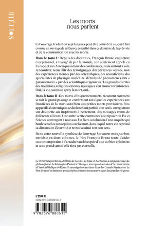 Cet ouvrage traduit en sept langues peut être considéré aujourd’hui comme un ouvrage de référence essentiel dans ce domaine de l’après-vie et de la communication avec les morts. Dans le tome I : Depuis des décennies, François Brune, enquêteur exceptionnel, a voyagé de par le monde, non seulement appelé en Europe et aux Amériques à faire des conférences, mais surtout à voir, rencontrer, recueillir des témoignages d’expériences vécues, non des expériences menées par des scientifiques, des acousticiens, des spécialistes de physique nucléaire, d’études de phénomènes dits « paranormaux » par des scientifiques rigoureux. Les grandes vérités des traditions, religions et textes mystiques s’en trouvent renforcées. Oui, la vie continue après la mort, oui… Dans le tome II : Des morts, cliniquement morts, racontent comment se fait le grand passage et confirment ainsi que les expériences aux frontières de la mort sont bien des petites morts provisoires. Nos appareils électroniques se déclenchent parfois tout seuls, enregistrant sur disquette, ou imprimant directement, des messages venus de différents ailleurs. Une autre vérité commence à s’imposer où Foi et Science convergent à nouveau. Un livre conclusion d’une enquête qui bouleverse les conceptions sur la mort, dans lequel notre vie reprend sa dimension d’éternité et retrouve ainsi tout son sens. Dans cette nouvelle synthèse de l’ouvrage Les morts nous parlent, enrichie en deux volumes, le Père François Brune tente d’aider ses contemporains à s’arracher au désespoir d’une vie bien éphémère et sans grand sens si elle n’est pas éternelle.