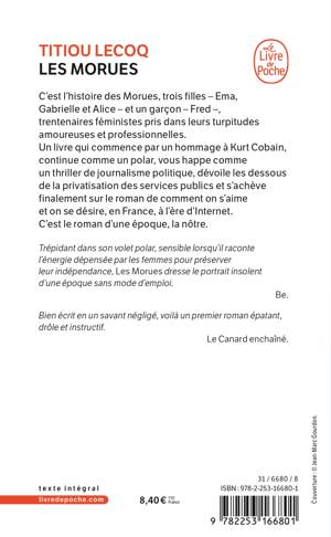 C'est l'histoire des Morues, trois filles - Ema, Gabrielle et Alice - et un garçon - Fred -, trentenaires féministes pris dans leurs turpitudes amoureuses et professionnelles. Un livre qui commence par un hommage à Kurt Cobain, continue comme un polar, vous happe comme un thriller de journalisme politique, dévoile les dessous de la privatisation des services publics et s'achève finalement sur le roman de comment on s'aime et on se désire, en France, à l'ère de l'internet. C'est le roman d'une époque, la nôtre.Trépidant dans son volet polar, sensible lorsqu'il raconte l'énergie dépensée par les femmes pour préserver leur indépendance, Les Morues dresse le portrait insolent d'une époque sans mode d'emploi. Un excellent premier roman. Be. Bien écrit en un savant négligé, voilà un premier roman épatant, drôle et instructif. Le Canard enchaîné.