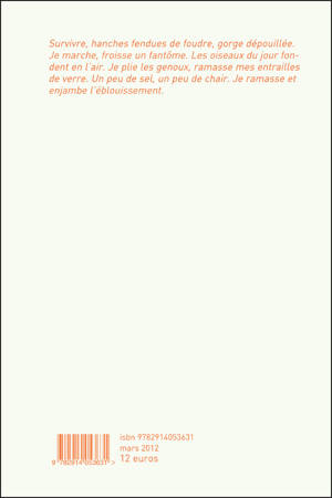 Survivre, hanches fendues de foudre, gorge dépouillée. Je marche, froisse un fantôme. Les oiseaux du jour fondent en l’air. Je plie les genoux, ramasse mes entrailles de verre. Un peu de sel, un peu de chair. Je ramasse et enjambe l’éblouissement. […] Avale-moi, dis-je au bois. Écorce-moi, dis-je à l’homme, lentement comme un coma. Terre et copeaux. Ma langue éboulée au creux du refuge.