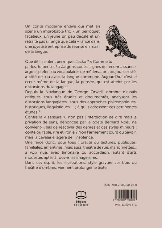 Un conte moderne enlevé qui met en scène un improbable trio - un perroquet facétieux, un jeune un peu décalé et un retraité pas si rangé que cela – lancé dans une joyeuse entreprise de reprise en main de la langue. Que dit l’insolent perroquet Jacko ? « Comme tu parles, tu penses ! » Jargons codés, signes de reconnaissance, argots, parlers ou vocabulaires de métiers… ont toujours existé, à côté de, ou avec, la langue commune. Aujourd’hui c’est le cœur même de la langue, la pensée, qui est atteint par les distorsions du langage ! Depuis la Novlangue de George Orwell, nombre d’essais critiques, tous très érudits et documentés, analysent les distorsions langagières sous des approches philosophiques, historiques, linguistiques… ; à qui s’adressent ces pertinentes études ? Contre la « sensure », non pas l’interdiction de dire mais la privation de sens, dénoncée par le poète Bernard Noël, ne convient-il pas de réactiver des genres et des styles mineurs : conte ou fable, rire et ironie ? Non l’armement lourd du Savoir, mais la cavalerie légère de l’insolence. Une farce donc, pour tous : oralité ou lectures, publiques, familiales, enfantines, mais aussi théâtre de rue, marionnettes… à voix nue, avec limonaire ou accordéon, autant d’arts modestes aptes à rouvrir les imaginaires. Dans cet esprit, les illustrations, style gravure sur bois ou théâtre d’ombre, viennent prolonger le texte.