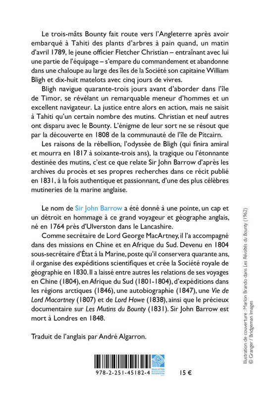 Le trois-mats Bounty fait route vers l'Angleterre apres avoir embarque a Tahiti des plants d'arbres a pain quand, un matin d'avril 1789, le jeune officier Fletcher Christian - entrainant avec lui une partie de l'equipage - s'empare du commandement et abandonne dans une chaloupe au large des iles de la Societe son capitaine William Bligh et dix-huit matelots avec cinq jours de vivres. Bligh navigue quarante-trois jours avant d'aborder dans l'ile de Timor, se revelant un remarquable meneur d'hommes et un excellent navigateur. La justice entre alors en action, mais ne saisit a Tahiti qu'un certain nombre des mutins. Christian et neuf autres ont disparu avec le Bounty. L'enigme de leur sort ne se resout que par la decouverte en 1808 de la communaute de l'ile de Pitcairn. Les raisons de la rebellion, l'odyssee de Bligh (qui finira amiral et mourra en 1817 a soixante-trois ans), la tragique ou l'etonnante destinee des mutins, c'est ce que relate Sir John Barrow d'apres les archives du proces et ses propres recherches dans ce recit publie en 1831, a la fois authentique et passionnant, d'une des plus celebres mutineries de la marine anglaise.