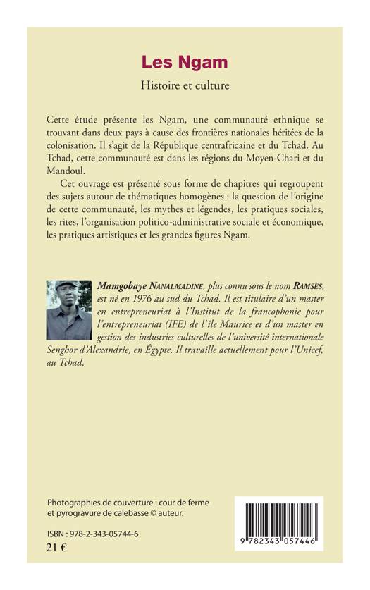 Cette étude présente les Ngam, une communauté ethnique se trouvant dans deux pays à cause des frontières nationales héritées de la colonisation. Il s'agit de la République centrafricaine et du Tchad. Cet ouvrage est présenté sous forme de chapitres qui regroupent des sujets autour de thématiques homogènes : la question de l'origine de cette communauté, les mythes et légendes, les pratiques sociales, les rites, l'organisation politico-administrative sociale et économique, les pratiques artistiques et les grandes figures Ngam.