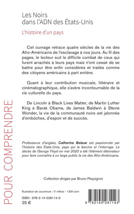 Cet ouvrage retrace quatre siècles de la vie des Afro-Américains de l'esclavage à nos jours. Au fil des pages, le lecteur suit le difficile combat de ceux qui furent arrachés à leurs pays mais n'ont cessé de se battre pour être enfin considérés et traités comme des citoyens américains à part entière. Quant à leur contribution musicale, littéraire et cinématographique, elle s'avère incontournable de la vie culturelle du pays. De Lincoln à Black Lives Matter, de Martin Luther King à Barak Obama, de James Baldwin à Stevie Wonder, la vie de la communauté noire est jalonnée d'embûches, d'espoir et de succès.