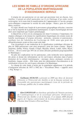 Aux Antilles, l'origine de son patronyme prend un relief particulier car il est l'héritage d'un ordre social esclavagiste, où le nom était la manifestation de l'appartenance à l'un des groupes socio-ethniques composant la société de cette époque : blancs, gens de couleur libres, esclaves. Ce livre situe l'existence, l'importance, les origines ethniques et donne les significations linguistiques de certains noms de famille martiniquais d'origine africaine : prénoms, surnoms et patronymes, attribués lors de l'abolition de l'esclavage de 1848.