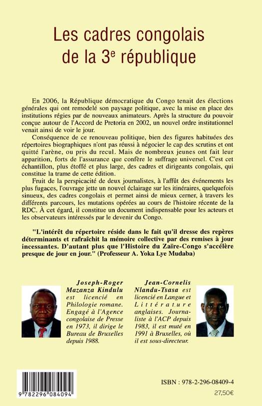 En 2006, la RDC tenait des élections générales qui ont remodelé son paysage politique. De nombreux jeunes ont fait leur apparition, forts de l'assurance que confère le suffrage universel. C'est cet échantillon des cadres et dirigeants congolais, qui constitue la trame de ce livre. Le répertoire jette un nouvel éclairage sur les itinéraires, quelquefois sinueux, des cadres congolais et permet ainsi de mieux cerner, à travers les différents parcours, les mutations opérées au cours de l'histoire récente de la RDC.