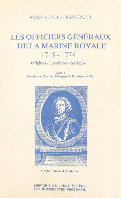 Michel VERGE - FRANCESCHI Docteur en Histoire, docteur d'État-ès-Lettres. Lauréat de l'Académie de Marine (1975), de l'Académie française (1978). Membre du Laboratoire d'Histoire maritime U.A. 211, C.N.R.S. - Sorbonne, et de la Commission Française d'Histoire maritime. CETTE THESE SOUTENUE POUR LE DOCTORAT D'ETAT-ES-LETTRES, A L'UNIVERSITE DE PARIS X - NANTERRE, LE 3 JUIN 1987 A OBTENU LA MENTION "TRES HONORABLE A L'UNANIMITE DU JURY". C'est un véritable outil prosopographique consacré à la Marine de guerre d'Ancien Régime. Anoblis, faux-nobles, Provençaux, Normands, Poitevins, gens du littoral ou de l'intérieur du royaume, Parisiens et Courtisans, voisinent dans la Marine du Roi et sont ici étudiés au plan de la naissance, de la fortune, du métier de marin. Les 131 généraux de mer du règne de Louis XV, joints à une partie des 65 généraux de mer du règne de Louis XIV (Tourville, Jean Bart, Duguay-Trouin), et à une partie de ceux du règne de Louis XVI et de la guerre d'Amérique aboutissent à un index de 14 329 noms propres, de 500 vaisseaux ou frégates, de 4 500 noms de lieux qui font revivre tout un pan de la société d'Ancien Régime (officiers de marine, armateurs malouins, câpres dunkerquois, hobereaux bretons, chevaliers de Malte provençaux, cadets de Bourgogne, gentilshommes vendéens, voire auvergnats compagnons d'armes d'un d'Estaing).