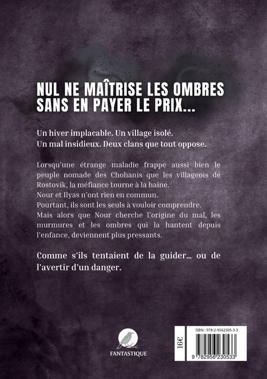 Nul ne maîtrise les ombres sans en payer le prix. Un hiver implacable. Un village isolé. Un mal insidieux. Deux clans que tout oppose. Lorsqu'une étrange maladie frappe aussi bien le peuple nomade des Chohanis que les villageois de Rostovik, la méfiance tourne à la haine. Nour et Ilyas n'ont rien en commun. Pourtant, ils sont les seuls à vouloir comprendre. Mais alors que Nour cherche l'origine du mal, les murmures et les ombres qui la hantent depuis l'enfance, deviennent plus pressants. Comme s'ils tentaient de la guider... ou de l'avertir du danger.