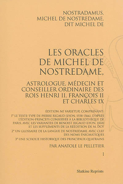 Les oracles de Michel de Nostredame, astrologue, médecin et conseiller ordinaire des rois Henri II, François II et Charles IX