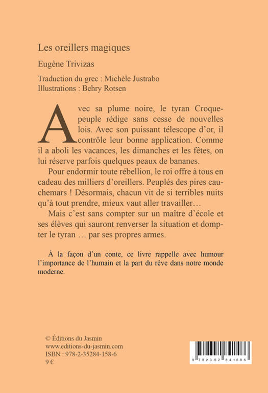 Avec sa plume noire, le roi Croque-peuple rédige sans cesse de nouvelles lois. Avec son télescope d’or, il vérifie leur bonne application. Mais comme ses sujets le détestent, pour endormir enfin toute rébellion, il leur offre à tous en cadeau des milliers d’oreillers. Peuplés des pires cauchemars ! Désormais, chacun vit de si terribles nuits qu’à tout prendre, mieux vaut aller travailler… Or un maître d’école, aidé de ses élèves, saura renverser la situation et vaincre le tyran … par ses propres armes.