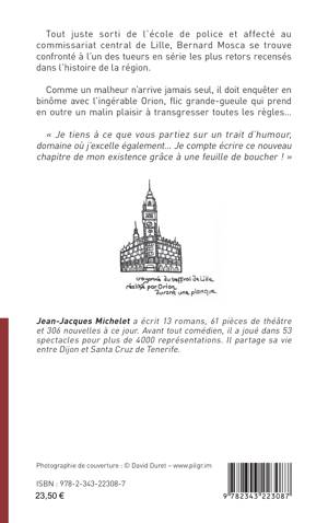 Tout juste sorti de l’école de police et affecté au commissariat central de Lille, Bernard Mosca se trouve confronté à l’un des tueurs en série les plus retors recensés dans l’histoire de la région. Comme un malheur n’arrive jamais seul, il doit enquêter en binôme avec l’ingérable Orion, flic grande-gueule qui prend en outre un malin plaisir à transgresser toutes les règles...« Je tiens à ce que vous partiez sur un trait d’humour, domaine où j’excelle également... Je compte écrire ce nouveau chapitre de mon existence grâce à une feuille de boucher ! »