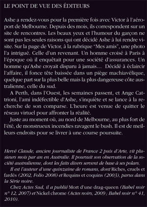 Ashe a rendez-vous pour la première fois avec Victor à l'aéroport de Melbourne. Depuis des mois, ils correspondent sur un site de rencontres. Les beaux yeux et l'humour du garçon ne sont pas les seules raisons qui ont décidé Ashe à lui rendre visite. Sur la page de Victor, à la rubrique "Mes amis", une photo l'a intrigué. Celle d'un revenant. Un homme croisé à Paris à l'époque où il enquêtait pour une société d'assurances. Un homme qu'Ashe croyait disparu à jamais... Décidé à éclaircir l'affaire, il fonce tête baissée dans un piège machiavélique, quelque part sur la plus belle mais la plus dangereuse côte australienne, celle du sud. A Perth, dans l'Ouest, les semaines passent, et Ange Cattrioni, l'ami indéfectible d'Ashe, s'inquiète et se lance à la recherche de son comparse. L'heure est venue de quitter le réseau virtuel pour affronter la réalité. Juste au moment où, au nord de Melbourne, au plus fort de l'été, de monstrueux incendies ravagent le bush. Il est de meilleurs endroits pour se livrer à une course poursuite.