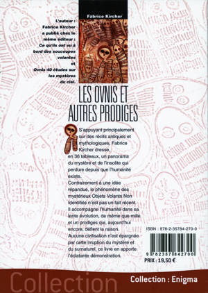 S’appuyant principalement sur des récits antiques et mythologiques, Fabrice Kircher dresse, en 36 tableaux, un panorama du mystère et de l’insolite qui perdure depuis que l’humanité existe. Contrairement à une idée répandue, le phénomène des mystérieux objets Volants Non Identifiés n’est pas un fait récent.?Il accompagne l’humanité dans sa lente évolution, de même que mille et un prodiges qui, aujourd’hui encore, défient la raison. Aucune civilisation n’est épargnée par cette irruption du mystère et du surnaturel, ce livre en apporte l’éclatante démonstration.