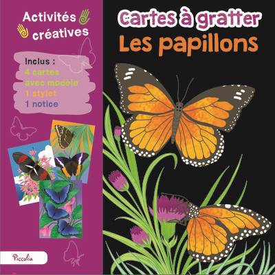 Une pochette de 4 cartes à gratter avec stylet et notice pas à pas sur le thème des papillons.