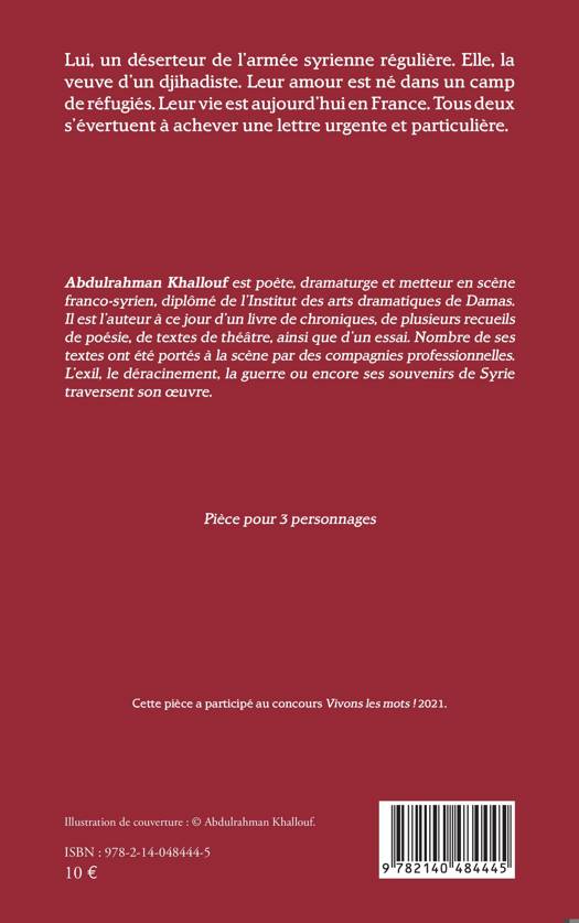 Lui, un déserteur de l'armée syrienne régulière. Elle, la veuve d'un djihadiste. Leur amour est né dans un camp de réfugiés. Leur vie est aujourd'hui en France. Tous deux s'évertuent à achever une lettre urgente et particulière.