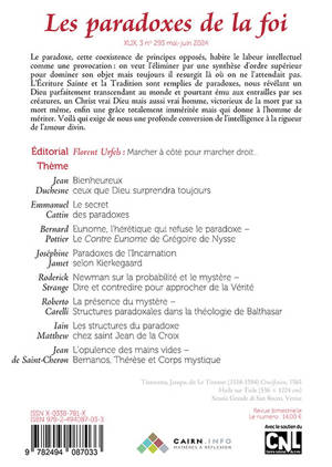Le paradoxe, cette coexistence de principes opposés, habite le labeur intellectuel comme une provocation : on veut l'éliminer par une synthèse d'ordre supérieur pour dominer son objet mais toujours il resurgit là où on ne l'attendait pas. L'Ecriture Sainte et la Tradition sont remplies de paradoxes, nous révélant un Dieu parfaitement transcendant au monde et pourtant ému aux entrailles par ses créatures, un Christ vrai Dieu mais aussi vrai homme, victorieux de la mort par sa mort même, enfin une grâce totalement imméritée mais qui donne à l'homme de mériter. Le présent cahier organise une visite guidée du paradoxe chrétien en s'arrêtant à divers de ses aspects : le saut de la foi, la morale chrétienne, l'orthodoxie dogmatique, l'expérience mystique...