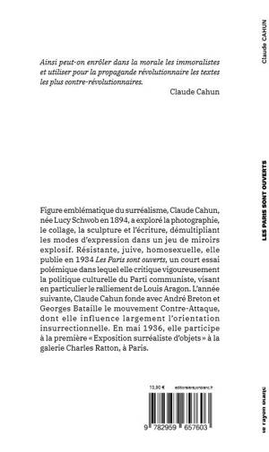 Quelle a été la place des femmes artistes dans le mouvementsurréaliste ? À l’occasion du centenaire de ce mouvement et en lien avecl’exposition Surréalisme au Centre Pompidou (3 septembre 2024 - 13 janvier2025), les éditions Le Rayon Blanc publient Les paris sont ouverts, un texteincisif de l’artiste et écrivaine Claude Cahun, initialement paru en 1934. Dans cet ouvrage audacieux, Cahun s'attaque à la politique culturelle duParti communiste français, visant Louis Aragon. Pour elle, la création,notamment poétique, n'est ni une échappatoire ni un outil de propagande, maisune véritable arme critique. Ce texte illustre l'engagement profondd'une figure emblématique du surréalisme. Il met également en lumière le rôleessentiel des femmes, souvent méconnu mais vital à l’essor de ce mouvement.
