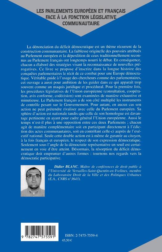 La dénonciation du déficit démocratique est un thème récurrent de la construction communautaire. La faiblesse originelle des pouvoirs attribués au Parlement européen et la déperdition de ceux traditionnellement reconnus au Parlement français ont longtemps nourri le débat. Ce livre se propose d'inscrire dans la longue histoire des conquêtes parlementaires le récit de ce combat pour une Europe démocratique. Véritable guide à l'usage des chercheurs comme des parlementaires, cet ouvrage a aussi pour ambition de les guider dans ce qui apparaît trop souvent comme un maquis juridique et procédural.