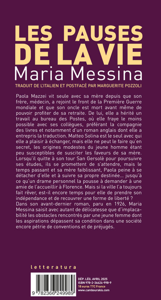 Paola Mazzei vit seule avec sa mère depuis que son frère, médecin, a rejoint le front de la Première Guerre mondiale et que son oncle est mort avant même de pouvoir profiter de sa retraite. De lui, elle a hérité un travail au bureau des Postes, où elle fraye le moins possible avec ses collègues, préférant la compagnie des livres et notamment d'un roman anglais dont elle a entrepris la traduction. Matteo Solina est le seul avec qui elle a plaisir à échanger, mais elle ne peut le faire qu'en secret, les origines modestes du jeune homme étant peu susceptibles de susciter les faveurs de sa mère. Lorsqu'il quitte à son tour San Gersolè pour poursuivre ses études, ils se promettent de s'attendre, mais le temps passant et sa mère faiblissant, Paola peine à se détacher d'elle et à suivre sa propre destinée... jusqu'à ce qu'un drame personnel la pousse à demander à une amie de l'accueillir à Florence. Mais si la ville l'a toujours fait rêver, est-il encore temps pour elle de prendre son indépendance et de recouvrer une forme de liberté ? Dans son avant-dernier roman, paru en 1926, Maria Messina saisit avec autant de délicatesse que d'implaca-bilité les obstacles rencontrés par une jeune femme dont les aspirations dépassent sa condition dans une société encore pétrie de conventions et de préjugés.