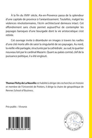 À la fin du XVIIIe siècle, Aix-en-Provence passa de la splendeur d’une capitale de province à l’anéantissement. Toutefois, malgré les violences révolutionnaires, l’écrin architectural demeura intact. Cet effondrement sans chute permet aujourd’hui de contempler les paysages baroques d’une bourgade dont la vie aristocratique s’est retirée. Cet ouvrage invite à déambuler en images à travers les ruelles d’une cité morte afin de saisir la singularité de ses paysages. Au nord, la vieille ville partagée, structurée par la cathédrale ; au sud, le quartier nouveau loti par le cardinal Mazarin. Quant au palais comtal, clef de la puissance politique, il a été englouti.