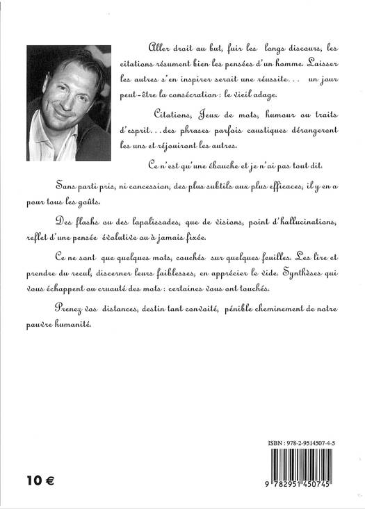 Aller droit au but, fuir les longs discours, les citations résument bien les pensées d'un homme. Laisser les autres s'en inspirer serait une réussite... un jour peut-être la consécration : le vieil adage. Citations, jeux de mots, humour aux traits d'esprit... des phrases parfois caustiques dérangeront les uns et réjouiront les autres. Ce n'est qu'une ébauche et je n'ai pas tout dit. Sans parti pris, ni concession, des plus subtils aux plus efficaces, il y en a pour tous les goûts. Des flashs ou des lapalissades, que de visions, point d'hallucinations, reflet d'une pensée évolutive ou à jamais fixée. Ce ne sont que quelques mots, couchés sur quelques feuilles. Les lire et prendre du recul, discerner leurs faiblesses, en apprécier le vide. Synthèses qui vous échappent ou cruauté des mots : certains vous ont touchés. Prenez vos distances, destin tant convoité, pénible cheminement de notre pauvre humanité.
