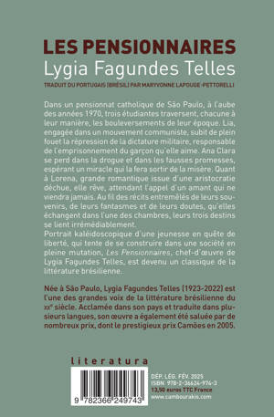 Dans un pensionnat catholique de São Paulo, à l'aube des années 1970, trois étudiantes traversent, chacune à leur manière, les bouleversements de leur époque. Lia, engagée dans un mouvement communiste, subit de plein fouet la répression de la dictature militaire, responsable de l'emprisonnement du garçon qu'elle aime. Ana Clara se perd dans la drogue et dans les fausses promesses, espérant un miracle qui la fera sortir de la misère. Quant à Lorena, grande romantique issue d'une aristocratie déchue, elle rêve, attendant l'appel d'un amant qui ne viendra jamais. Au fil des récits entremêlés de leurs souvenirs, de leurs fantasmes et de leurs doutes, qu'elles échangent dans l'une des chambres, leurs trois destins se lient irrémédiablement. Portrait kaléidoscopique d'une jeunesse en quête de liberté, qui tente de se construire dans une société en pleine mutation, "Les Pensionnaires", chef-d'oeuvre de Lygia Fagundes Telles, est devenu un classique de la littérature brésilienne.