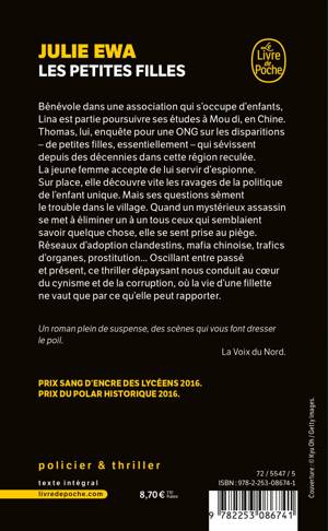 Réseaux d'adoption clandestins, mafias chinoises, trafics d'organes, prostitution... Oscillant entre passé et présent, un thriller dépaysant qui nous conduit au cœur d'une Chine cynique et corrompue, où la vie d'une petite fille ne vaut que par ce qu'elle peut rapporter.