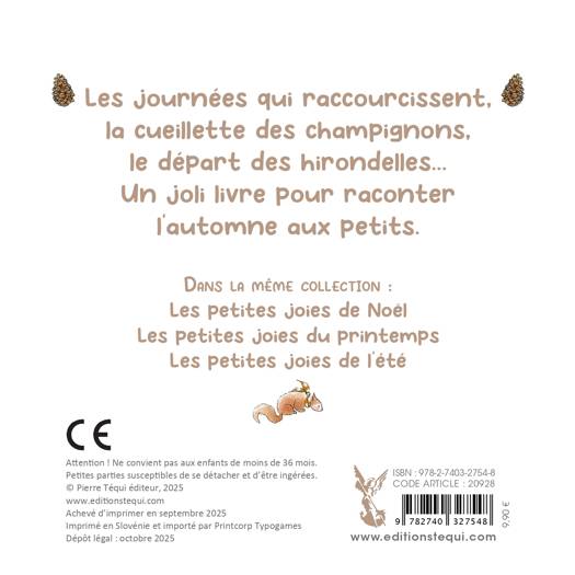 Les journées qui raccourcissent, les vendanges qui approchent, les pommes et les poires, les champignons dans les sous-bois, le départ des hirondelles vers les pays chauds… Ce petit livre invite les jeunes enfants à faire attention aux détails de la nature qui nous offre encore tant de richesses avant d'entrer dans son sommeil d'hiver. Guidé par ses parents ou éducateurs, l'enfant apprendra à observer, s'intéresser, admirer, s'émerveiller pour comprendre la joie de l’automne qui culmine à la Toussaint, fête de la vie et de l'espérance. Avec ses phrases courtes et simples, ce livre pourra aussi intéresser l'enfant qui commence à lire tout seul. Une jolie collection de petits livres à emporter à la messe.