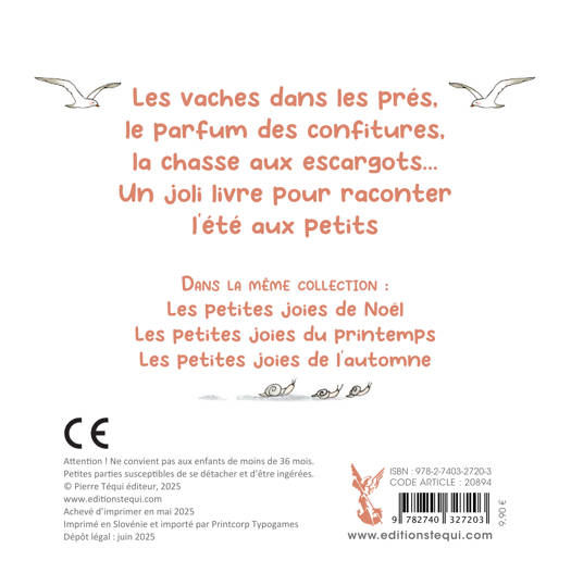 Vaches et chevaux, confiture, châteaux de sable, marmottes… une évocation des petits bonheurs de la belle saison, couronnés par la fête de l'Assomption. Ce petit livre invite les jeunes enfants à goûter les joies de l'été. Guidé par ses parents ou éducateurs, l'enfant apprendra à observer, s'intéresser, admirer, s'émerveiller. Avec ses phrases courtes et simples, ce livre pourra aussi intéresser l'enfant qui commence à lire tout seul. Une jolie collection de petits livres à emporter à la messe.