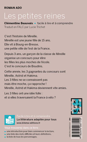 UN LIVRE FACILE À LIRE ET À COMPRENDRE ! C’est l’histoire de Mireille. Mireille est une jeune fille de 15 ans. Elle vit à Bourg-en-Bresse, une petite ville de l’est de la France. Depuis 3 ans, un garçon de la classe de Mireille organise un concours pour élire les filles les plus moches de l’école. C’est le concours de Boudins. Cette année, les 3 gagnantes du concours sont Mireille, Astrid et Hakima. Les 3 filles ne se connaissent pas mais être moche, ça rapproche ! Mireille, Astrid et Hakima deviennent vite amies Les 3 filles ont une idée folle : et si elles traversaient la France à vélo ? (Re)découvrez l'incontournable livre de Clémentine Beauvais, enfin accessible à tous !