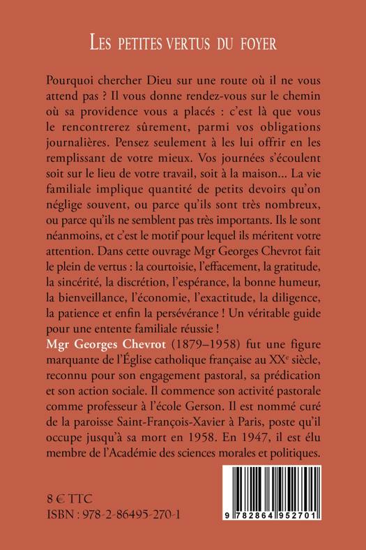 Pourquoi chercher Dieu sur une route où il ne vous attend pas ? Il vous donne rendez-vous sur le chemin où sa providence vous a placés : c'est là que vous le rencontrerez sûrement, parmi vos obligations journalières. Pensez seulement à les lui offrir en les remplissant de votre mieux. Vos journées s'écoulent soit sur le lieu de votre travail, soit à la maison... La vie familiale implique quantité de petits devoirs qu'on néglige souvent, ou parce qu'ils sont très nombreux, ou parce qu'ils ne semblent pas très importants. Ils le sont néanmoins, et c'est le motif pour lequel ils méritent votre attention.