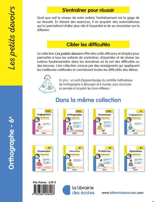 Un entraînement efficace est un gage de réussite : grâce aux séances minutées des Petits devoirs, l'objectif de chaque série d'exercices est clairement formulé, et la progression est conçue par des enseignants expérimentés pour qu'il soit atteint quel que soit le niveau de votre enfant. Pour chaque notion, la série d'exercices est précédée d'une leçon brève et claire. Tous les exercices sont corrigés. Le cahier propose des mémos (conjugaisons, tables de multiplication...) très pratiques sur le verso de la couverture.