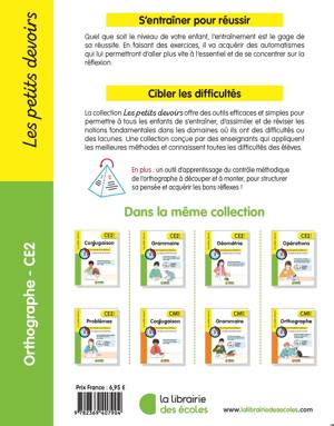 Un entraînement efficace est un gage de réussite : grâce aux séances minutées des Petits devoirs, l'objectif de chaque série d'exercices est clairement formulé, et la progression est conçue par des enseignants expérimentés pour qu'il soit atteint quel que soit le niveau de votre enfant. Pour chaque notion, la série d'exercices est précédée d'une leçon brève et claire. Tous les exercices sont corrigés. Le cahier propose des mémos (conjugaisons, tables de multiplication...) très pratiques sur le verso de la couverture.