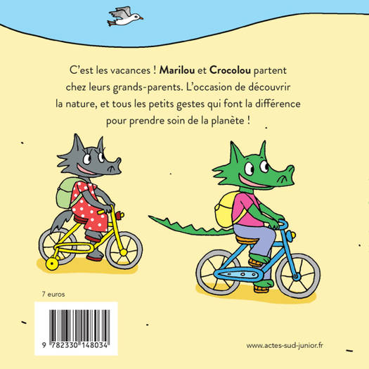 Pour le dernier jour de classe, la maîtresse a parlé d'écologie. Marilou et Crocolou partent en vacances chez leurs grands-parents, et ils sont bien décidés à appliquer tout ce qu'ils ont appris ! Sur la plage, ils ramassent les déchets tout en s'amusant : une bouteille et quelques chiffons sont si vite recyclés en une jolie poupée... Au marché, ils achètent tout en vrac. Et à table, ils disent non au gaspillage ! Le soir venu, après une belle journée passée à faire attention à la planète, c'est l'heure du bain... Mais cette fois-ci, ils prendront plutôt une douche ! Un nouveau titre idéal pour aborder l'écologie avec les plus petits, et qui regorge de bonnes idées.