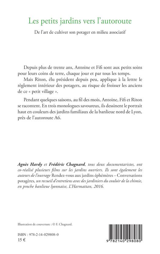 Depuis plus de trente ans, Antoine et Fifi sont aux petits soins pour leurs coins de terre, chaque jour et par tous les temps. Mais Riton, lu pr sident depuis peu, applique la lettre le rglement int rieur des potagers, au risque de froisser les anciens de ce Ç petit village È. Pendant quelques saisons, au fil des mois, Antoine, Fifi et Riton se racontent. En trois monologues savoureux, ils dessinent le portrait haut en couleurs des jardins familiaux de la banlieue nord de Lyon, prs de lÕautoroute A6.