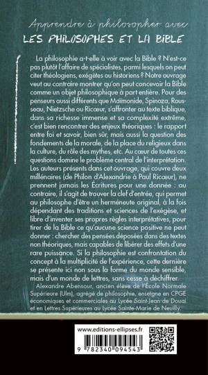 La philosophie a-t-elle à voir avec la Bible ? N’est-ce pas plutôt l’affaire de spécialistes, parmi lesquels on peut citer théologiens, exégètes ou historiens ?  La Bible occupe une place telle dans la culture occidentale que la philosophie l’a nécessairement rencontrée comme « objet culturel ». Mais rien de plus ? Notre ouvrage veut au contraire montrer qu’on peut concevoir la Bible comme un objet philosophique à part entière. Pour des penseurs aussi différents que Maïmonide, Spinoza, Rousseau, Nietzsche ou Ricœur, s’affronter au texte biblique, dans sa richesse immense et sa complexité extrême, c’est bien rencontrer des enjeux théoriques : le rapport entre foi et savoir, bien sûr, mais aussi la question des fondements de la morale, de la place du religieux dans la culture, du rôle des mythes etc. Au cœur de toutes ces questions, domine le problème central de l’interprétation. Les auteurs présents dans cet ouvrage, qui couvre deux millénaires (de Philon d’Alexandrie à Paul Ricœur), ne prennent jamais les Écritures pour une donnée : au contraire, il s’agit de trouver la clef d’entrée, qui permet au philosophe d’être un herméneute original, à la fois dépendant des traditions et sciences de l’exégèse, et libre d’inventer ses propres règles interprétatives, pour tirer de la Bible ce qu’aucune science positive ne peut donner : chercher des pensées déposées dans des textes non théoriques, mais capables de libérer des effets d’une rare puissance. Si la philosophie est confrontation du concept à la multiplicité de l’expérience, cette dernière se présente ici non sous la forme du monde sensible, mais d’un monde de lettres, sans cesse à déchiffrer.