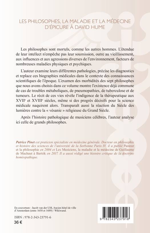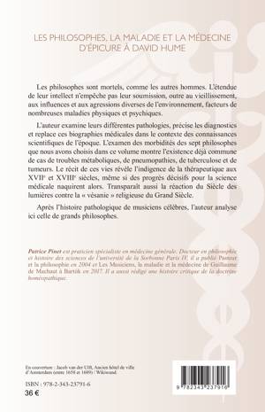 Les philosophes sont mortels, comme les autres hommes. L’étendue de leur intellect n’empêche pas leur soumission aux influences et aux agressions diverses de l’environnement. L’auteur examine leurs différentes pathologies et replace ces biographies médicales dans le contexte des connaissances scientifiques de l’époque. L’examen des morbidités des sept philosophes que nous avons choisis montre l’existence déjà commune de cas de troubles métaboliques, de pneumopathies et de tuberculose. Le récit de ces vies révèle l’indigence de la thérapeutique aux XVIIe et XVIIIe siècles, même si des progrès décisifs pour la science médicale naquirent alors.