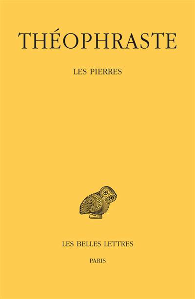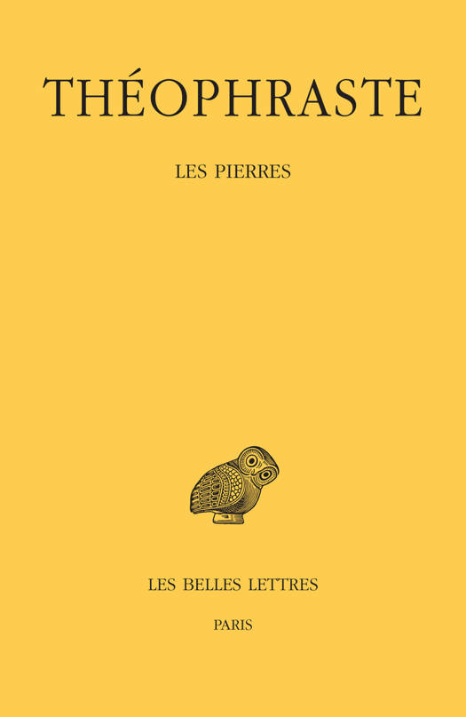 Avec Theophraste, Les pierres, s'acheve l'edition dans la CUF des etudes zoologiques, botaniques, mineralogiques effectuees au IVe siecle av. J.-C. par les naturalistes grecs Aristote (pour les animaux) et son disciple Theophraste (dans les deux autres domaines). Apres la mort d'Aristote, Theophraste a prolonge l'oeuvre de son maitre par la redaction des Recherches sur les plantes (5 vol. dans la CUF) et des Causes des phenomenes vegetaux (3 vol. ibid.).A une epoque ou la mineralogie ne s'appuyait pas sur l'analyse chimique, un ouvrage traitant des pierres ne pouvait que decrire les mineraux bruts, leurs gisements en Grece et ailleurs, leurs usages et proprietes. L'ouvrage, redige vers 310 av. J.-C., comprenait, d'apres l'auteur lui-meme, trois livres dont les deux premiers traitaient des pierres precieuses (or, argent) ou particulierement utiles (cuivre, etain, fer, etc.). Ils ont disparu des l'Antiquite, victimes des convoitises que l'on imagine. L'ouvrage que voici est donc le dernier livre, reserve aux materiaux de construction et d'ornement, aux teintures dont l'Antiquite faisait grand usage, ainsi qu'a des mineraux apparemment aussi eloignes les uns des autres que le charbon et l'ambre.
