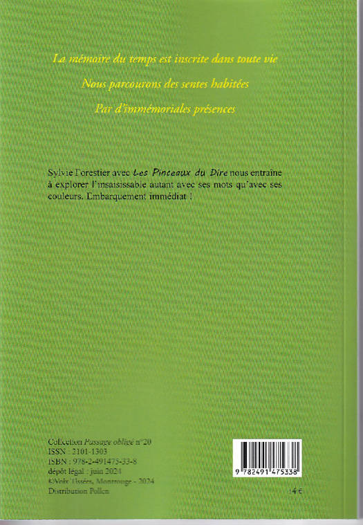 Livre de poèmes, chacun avec un tableau. Sylvie Forestier est l'autrice des deux. Dire lequel est premier dans la création ? Peut-être les couleurs qui donnent corps aux mots, comme l'indique le titre ; "Les Pinceaux du Dire". Ses peintures aux couleurs pures, laissent libre court à notre imaginaire, tout en construisant l'histoire, comme un accouchement de la parole par les couleurs.