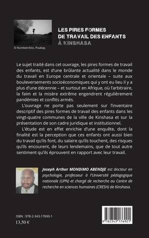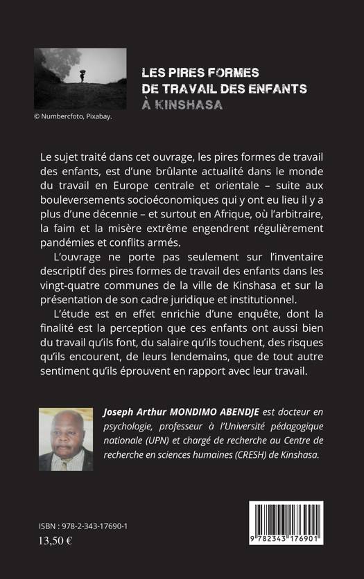 Cet ouvrage ne porte pas seulement sur l'inventaire descriptif des pires formes de travail des enfants dans les vingt-quatre communes de la ville de Kinshasa et sur la présentation de son cadre juridique et institutionnel. L'étude est en effet enrichie d'une enquête, dont la finalité est la perception que ces enfants ont aussi bien du travail qu'ils font, du salaire qu'ils touchent, des risques qu'ils encourent, de leurs lendemains, que de tout autre sentiment qu'ils éprouvent en rapport avec leur travail.