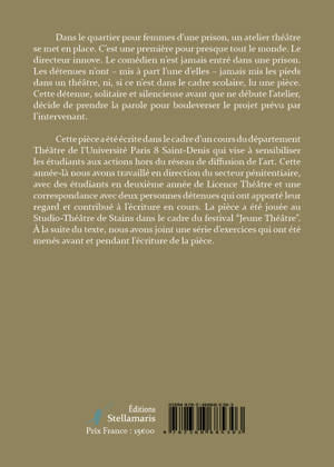 Cette pièce a été écrite dans le cadre d’un cours du département Théâtre de l’Université Paris 8 Saint-Denis qui vise à sensibiliser les étudiants aux actions hors du réseau de diffusion de l’art. Cette année-là nous avons travaillé en direction du secteur pénitentiaire, avec des étudiants en deuxième année de Licence Théâtre et une correspondance avec deux personnes détenues qui ont apporté leur regard et contribué à l’écriture en cours. La pièce a été jouée au Studio-Théâtre de Stains dans le cadre du festival “Jeune Théâtre”. À la suite du texte, nous avons joint une série d’exercices qui ont été menés avant et pendant l’écriture de la pièce.