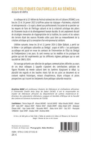 Le colloque de la 11eme édition du Festival national des Arts et Cultures (FESNAC) a eu lieu les 23 et 24 janvier 2023 à Kaffrine autour du triptyque Patrimoine, créativité et entrepreneuriat . Ce sujet a donné aux professionnels l'occasion de se pencher sur les moyens de faire de l'héritage culturel et de la créativité artistique des piliers de l'économie locale et du développement humain durable. Ils ont amplement discuté de stratégies innovantes de réappropriation de la tradition, les savoirs et les valeurs des terroirs étant des sources fécondes utiles aussi bien au renouvellement de la création artistique qu'à la conception d'un entrepreneuriat solidaire. L'édition suivante, tenue les 10 et 11 janvier 2024 à Djilor Djidiack, a porté sur le thème Les politiques culturelles au Sénégal acquis et défis . Les participants au colloque ont passé en revue les contours de l'intervention de l'État du Sénégal de l'indépendance à nos jours. Ils sont revenus sur les modèles et les pratiques de gestion qui ont été expérimentés par les différents régimes politiques qui se sont succédé de 1960 à 2024. Cet ouvrage présente une sélection de quelques communications délivrées au cours de ces deux colloques à laquelle s'ajoutent des contributions spéciales de figures fécondes du monde culturel dont les lumières élargissent le débat. La pluralité des regards et des touches réunis fait de ces actes un document où se croisent repères historiques, retours d'expériences, bilans critiques et pistes prospectives qui tracent les linéaments d'une politique culturelle novatrice.
