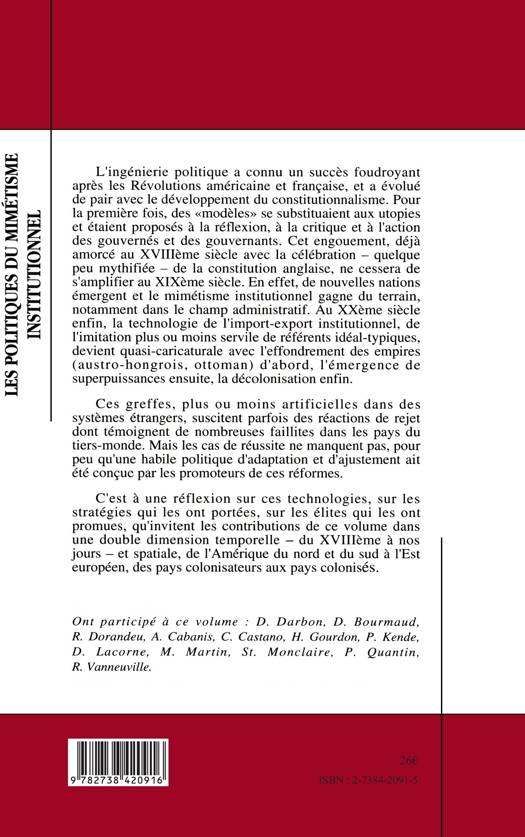 L'ingénierie politique a connu un succès foudroyant après les Révolutions américaine et française, et a évolué de pair avec le développement du constitutionnalisme. Pour la première fois, des «modèles» se substituaient aux utopies et étaient proposés à la réflexion, à la critique et à l'action des gouvernés et des gouvernants. Cet engouement, déjà amorcé au XVIIIème siècle avec la célébration - quelque peu mythifiée - de la constitution anglaise, ne cessera de s'amplifier au XIXème siècle. En effet, de nouvelles nations émergent et le mimétisme institutionnel gagne du terrain, notamment dans le champ administratif. Au XXème siècle enfin, la technologie de l'import-export institutionnel, de l'imitation plus ou moins servile de référents idéal-typiques, devient quasi-caricaturale avec l'effondrement des empires (austro-hongrois, ottoman) d'abord, l'émergence de superpuissances ensuite, la décolonisation enfin.