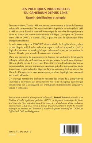 De toute évidence, l’année 1945 peut être reconnue comme le début de l’aventure industrielle camerounaise. L’auteur met en lumière le fait que la politique industrielle du Cameroun ne soit pas encore formellement théorisée. Elle est plutôt pensée à travers des Plans Directeurs d’Industrialisation, et instrumentalisée par une bureaucratie autoritaire qui pilote une économie duale à travers des projets industriels dispersés dans les secteurs agricole et minier. Les Plans de développement ont démontré leur relative efficacité. Cet ouvrage permet une évaluation mesurée des leviers de la compétitivité industrielle et propose des anticipations pour une émergence économique conditionnée par la conjugaison des intelligences institutionnelle, corporative, sociale et territoriale.