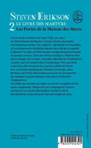 Sur le vaste continent de Sept-Cités, au cœur du Saint-Désert de Raraku, l’oracle Sha’ik rassemble son immense armée. Son objectif : déchaîner le Tourbillon, un soulèvement prophétisé depuis des siècles et qui deviendra l’un des conflits les plus sanglants que le monde ait jamais connus. Dans les mines d’otataral, Félisine rêve de se venger de sa sœur, nouvelle adjointe de l’impératrice Laseen, qui l’a condamnée à l’esclavage. Pour parvenir à ses fins, la jeune fille devra s’associer à un ancien prêtre de Fener et à une brute mystérieuse. Pendant ce temps, deux Brûleurs de Ponts désormais hors-la-loi se sont promis de ramener la jeune Apsalar chez elle et d’éliminer l’impératrice.