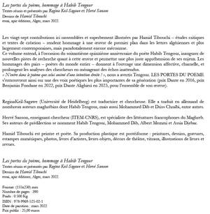 Les portes du poème, hommage à Habib Tengour Textes réunis et présentés par Regina Keil-Sagawe et Hervé Sanson Dessins de Hamid Tibouchi essai, apic éditions, Alger, novembre 2022. Les vingt-sept contributions ici rassemblées et superbement illustrées par Hamid Tibouchi – études critiques et textes de création – rendent hommage à une œuvre de premier plan dans les lettres algériennes et plus largement contemporaines, mais paradoxalement encore méconnue. Ce volume entend, à l’occasion du soixantième-quinzième anniversaire du poète Habib Tengour, inaugurer de nouvelles pistes de recherche quant à cette œuvre et permettre une plus juste appréhension de ses enjeux. Les hommages des pairs – poètes du monde entier – donnent à l’ouvrage une dimension affective, charnelle, et prolongent les analyses des chercheurs en ménageant des échos inattendus. « N’entre dans le poème que celui animé d’une intention droite ! », nous a avertis Tengour. LES PORTES DU POEME s’entrouvrent ainsi sur une des voix poétiques les plus importantes de sa génération (prix Dante en 2016, prix Benjamin Fondane en 2022, prix Dante Alighieri en 2023, pour l’ensemble de son œuvre). Regina Keil-Sagawe (Université de Heidelberg) est traductrice et chercheuse. Elle a traduit en allemand de nombreux auteurs maghrébins dont Habib Tengour, mais aussi Mohammed Dib et Driss Chraïbi, entre autres. Hervé Sanson, enseignant-chercheur (ITEM-CNRS), est spécialiste des littératures francophones du Maghreb. Ses auteurs de prédilection se nomment Habib Tengour, Mohammed Dib, Albert Memmi et Assia Djebar. Hamid Tibouchi est peintre et poète. Sa production plastique est protéiforme : peintures, dessins, gravures, estampes numériques, photos, livres d’artistes, livres-objets, décors de théâtre, vitraux, illustrations de livres et revues.