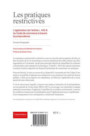 Les pratiques commerciales restrictives sont au coeur des préoccupations de plus en plus d'acteurs de la vie économique en raison notamment des effets néfastes qu'elles engendrent sur l'économie. Ayant pour principal objectif de rééquilibrer les relations commerciales entre opérateurs économiques, l'article L. 442-6 du code de commerce constitue la pierre angulaire du dispositif permettant de sanctionner ces pratiques. Souvent décriée, la mise en oeuvre de ce dispositif n'a pourtant pas fait l'objet d'une analyse susceptible d'apporter aux entreprises et aux praticiens une grille de lecture globale, si bien qu'eu égard à son importance, un bilan de l'application de ce texte paraît des plus intéressant. C'est la raison pour laquelle, à travers une analyse exhaustive de la jurisprudence sur une période de 10 ans (entre 2004 et 2013), cet ouvrage vise à permettre à chaque opérateur économique d'apprécier l'équilibre de sa relation commerciale, à travers les conditions retenues par la jurisprudence pour l'application du texte,