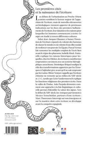 Les débuts de l'urbanisation au Proche-Orient ancien semblent le facteur majeur de l'apparition de l'écriture, mais de nouvelles découvertes archéologiques viennent apporter de précieuses indications sur les lieux des balbutiements de l'écriture, leur datation et les raisons pour lesquelles les hommes commencent à écrire. Ce sujet est étudié à travers différentes cultures : Mésopotamie, Égypte, Moyen-Orient et Méditerranée, Chine, vallée de l'Indus et continent américain (Aztèques). Cet ouvrage est une nouvelle édition.