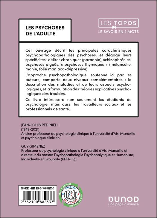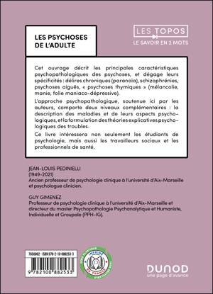 L'ouvrage décrit les principales caractéristiques psychopathologiques des psychoses, puis dégage leurs spécificités : délires chroniques (paranoïa), schizophrénies, psychoses aiguës, « psychoses thymiques » (mélancolie, manie, folie maniaco-dépressive). L’approche psychopathologique, soutenue par les auteurs, comporte deux niveaux complémentaires : la description des maladies et de leurs aspects psychologiques, la formulation des théories explicatives psychologiques des troubles. Ce livre s’adresse aux étudiants de psychologie, mais aussi aux travailleurs sociaux et aux professionnels de santé.