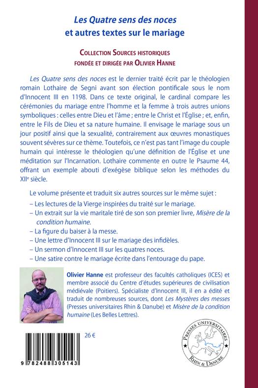 Les Quatre sens des noces est le dernier traité écrit par le théologien romain Lothaire de Segni avant son élection pontificale sous le nom d’Innocent III en 1198. Dans ce texte original, le cardinal compare les cérémonies du mariage entre l’homme et la femme à trois autres unions symboliques : celles entre Dieu et l’âme ; entre le Christ et l’Église ; et, enfin, entre le Fils de Dieu et sa nature humaine. Il envisage le mariage sous un jour positif ainsi que la sexualité, contrairement aux œuvres monastiques souvent sévères sur ce thème. Toutefois, ce n’est pas tant l’image du couple humain qui intéresse le théologien qu’une définition de l’Église et une méditation sur l’Incarnation. Lothaire commente en outre le Psaume 44, offrant un exemple abouti d’exégèse biblique selon les méthodes du XIIe siècle.
